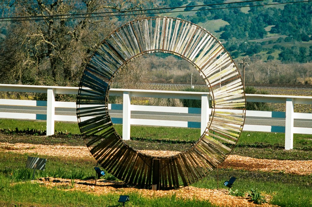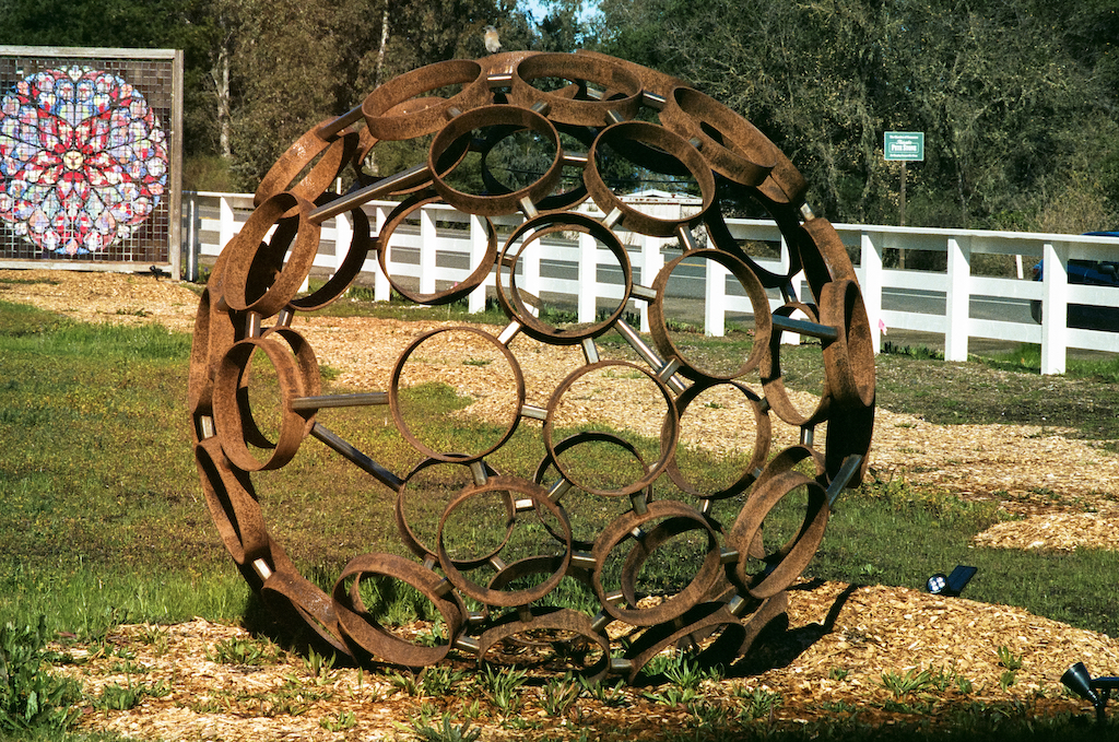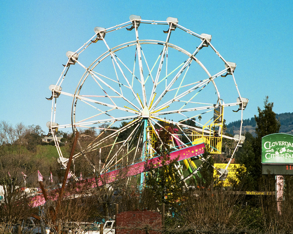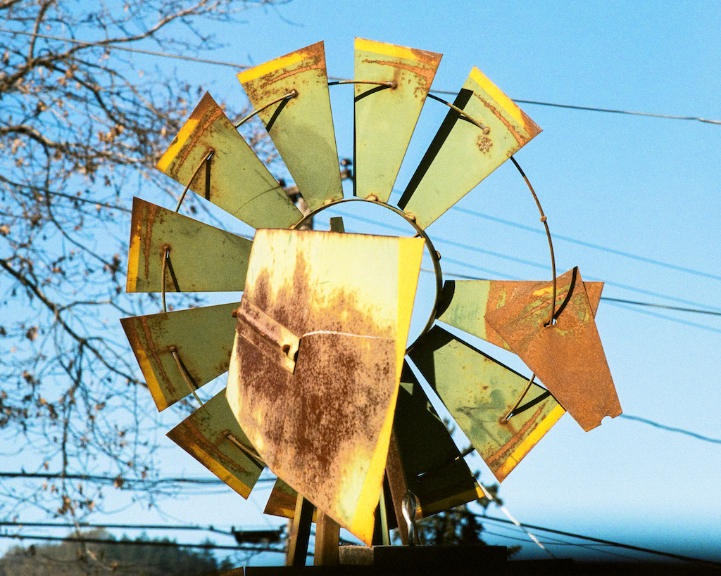 Last year’s Phantom Businesses was my first attempt at a photographic typology. I found the process of finding, photographing, editing, and presenting the images so satisfying that I knew I had to do it again. I toyed with the idea of an alphabet – pictures of letters on signs, but that seemed trite. Maybe an alphabet of found shapes – branches, fence posts, machinery parts? That might be interesting but it would take a while to collect all 26. “L” or “O” or even “S” would be easy to find, but where is a branch in the shape of “G” or “R”? I needed something a little more accessible. I considered several shapes and eventually settled on . . . circles! – they’re everywhere. I started photographing on Kodak Portra 400 in a Minolta XG-M with either the 45mm MD-Rokkor-X f2 or the 135mm MC Tele Rokkor f2.8. The challenges, without the immediate feedback of digital, were: 1. to photograph exactly straight on so the circles didn’t look like ovals; 2. to tightly frame in the viewfinder with enough allowance for minimal cropping of the scans in Lightroom; and 3. to make those final crops produce circles that were all the same size, considering that some of them had indistinct edges and also accounting for my limited post-processing skills. This is a work in progress – I’m still shooting around Ukiah and I know that I have some very promising (but yet unseen) circles on the current roll of film from Geyserville, Cloverdale, and Hopland. I may include signs with words like “circle” or “halo” – but we’ll see. [5/27/19 note: 45 of these have been printed as a typology, and yes on the circle words.]